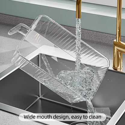 Keep your fridge neat and your food fresh with the Stackable Refrigerator Storage Box – a clear container with a secure lid and convenient handle for easy access.